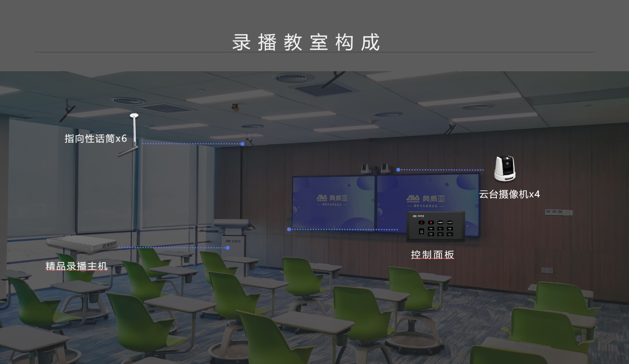 讲台内嵌触控一体机终端系统控制面板能一键式开关机及录课,教室讲台上端安装的小飞碟无感扩音支持360°全向拾音,教师可以自由表达肢体语言、随意走动,全程都毫无负担、不受干扰。6台指向性话筒、4台云台摄像机和精品录播主机,保证全自动跟踪式的高清录制,各类课程影像即录即拷,方便快捷。